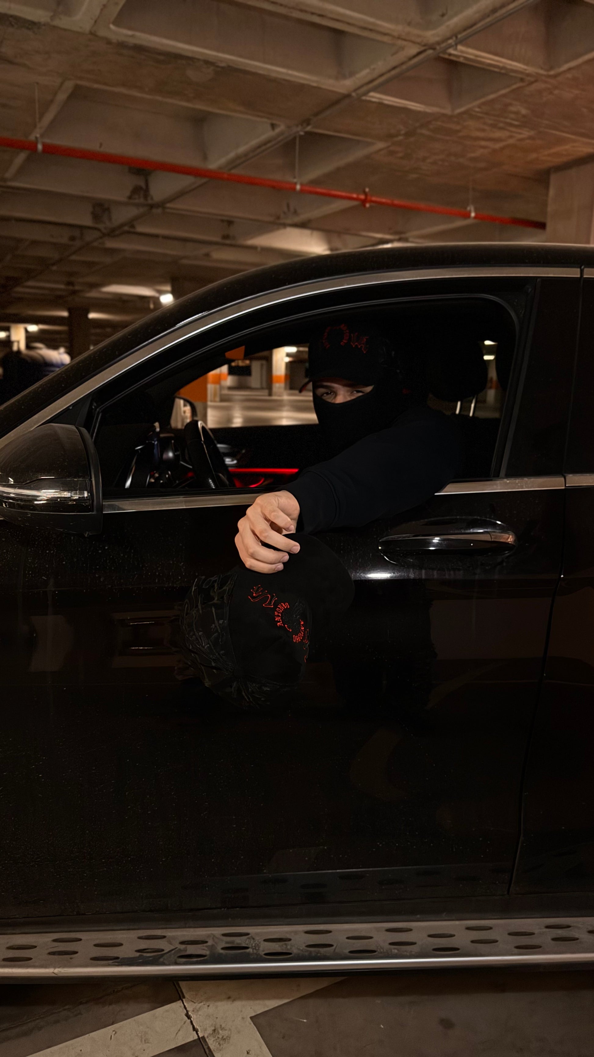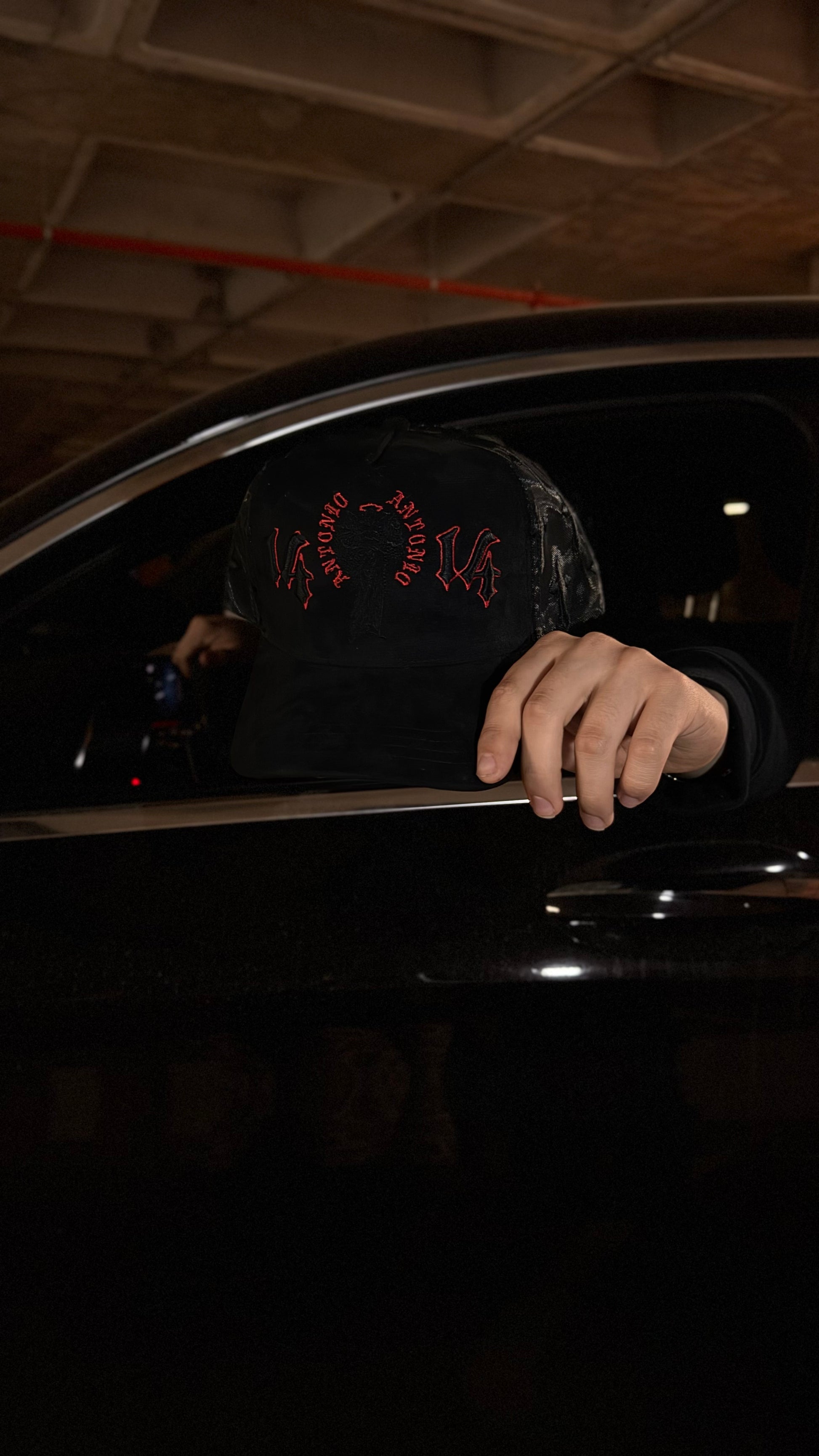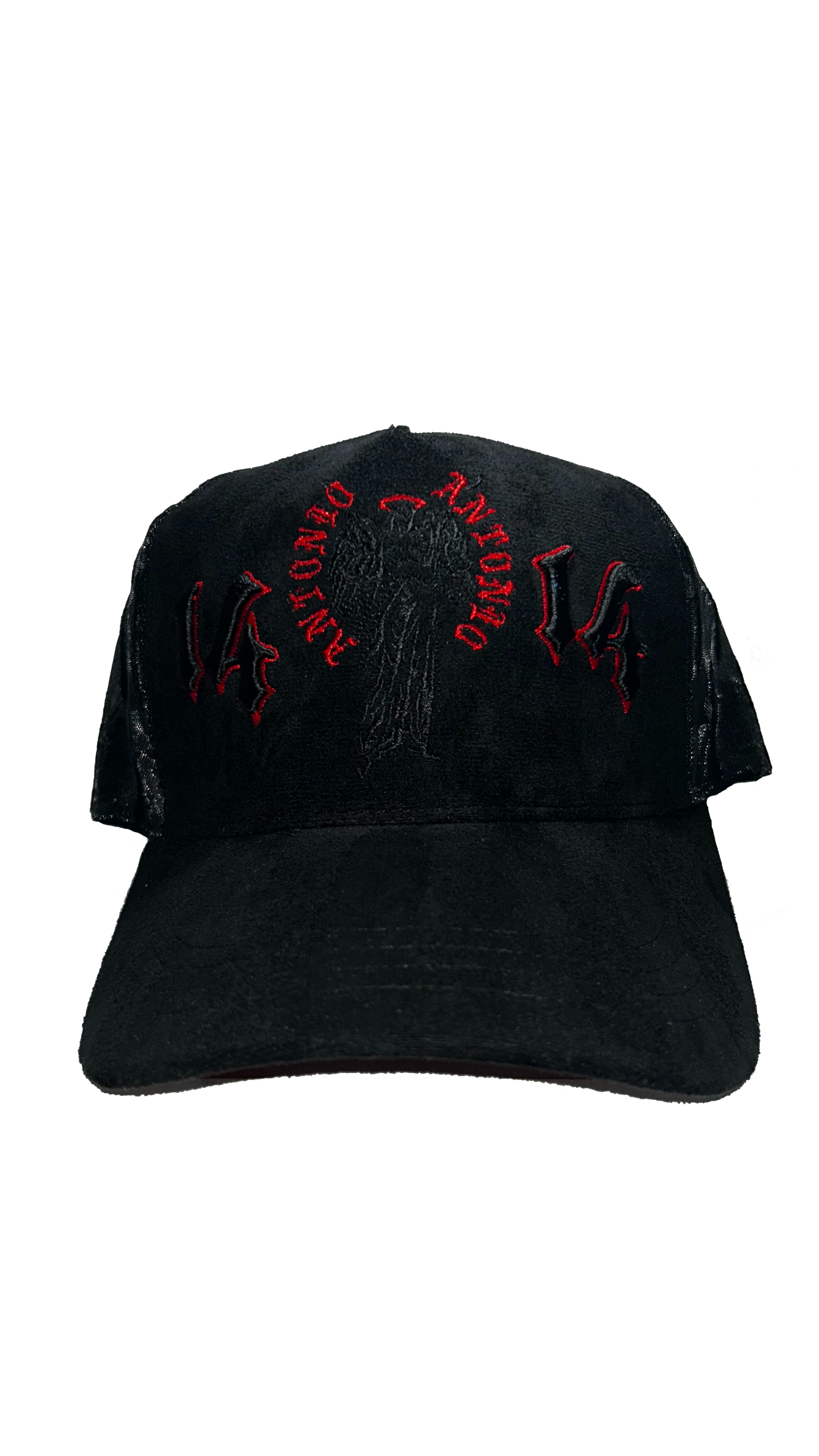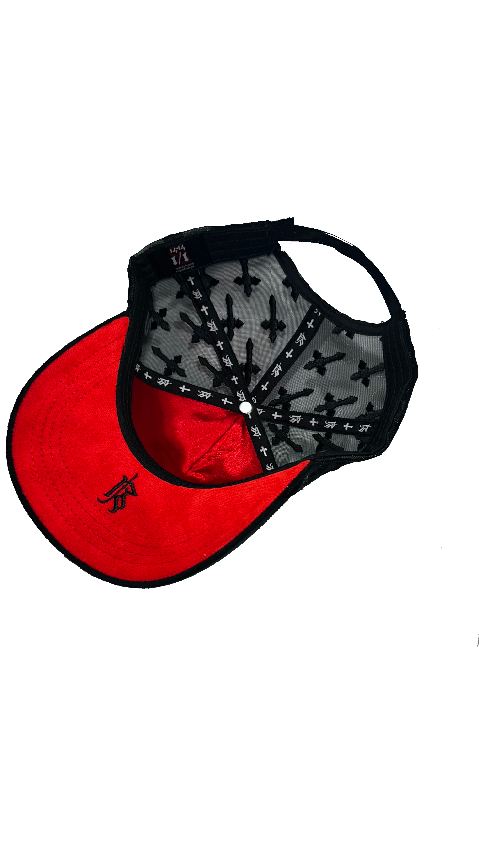 Corona y visera 100% gamuza con detalles en negro y rojo, malla transparente con bordados de cruces 3D